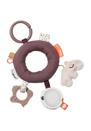 Der Activity-Ring weckt die Neugier des Babys und lässt es die verschiedenen Details entdecken: ein weicher Beißring, der beim Zahnen hilft, ein Rasselspiegel, ein samtig weicher Ozzo, Knistergeräusche und lustige Etiketten. Das Spielzeug ist für kleine Finger leicht zu greifen und an der elastischen Schleife kann ein Schnuller oder ein Spielzeug befestigt werden. Verwenden Sie den Universalring, um das Spielzeug an einer Spielmatte, am Kinderwagen, Autositz oder Bettchen zu befestigen.