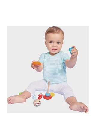 Das süße Stecktier als Maus besteht aus sechs bunten Holzringen in verschiedenen Farben und Größen. Dieses Steckspiel, bei dem die Ringe der Größe nach aufgesteckt werden müssen, fördert die Motorik und die Hand-Auge-Koordination der Kinder ab einem Jahr.
