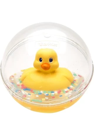 eine fröhliche, gelbe Ente in durchsichtiger Kugel