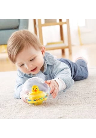 Größere Kinder werden der Kugel begeistert hinterherkrabbeln. Zum Greifen passt die Kugel perfekt in kleine Kinderhände. In ihrem Inneren wirbelt Konfetti herum, das zum Schütteln einlädt. Beim Anstupsen, Greifen, Loslassen und Schütteln der Kugel wird die Feinmotorik des Kindes gefördert. Und beim Hinterherkrabbeln wird seine Grobmotorik geschult.