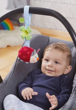Was macht denn der süße Käfer an der Baby-Schale. Die niedliche Hängefigur begeistert kleine Entdecker im Nu und begleitet Babys daheim und unterwegs. Der kleine Käfer ermuntert mit bunten Farben zum Betrachten und Spielen!