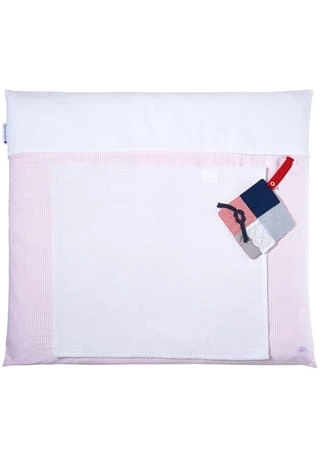 Praktische Wickelauflage der Marke NORDIC COAST COMPANY. Die traumhafte Wickelauflage aus 100% Baumwolle ist nicht nur nachhaltig und umweltfreundlich, sondern auch funktional durchdacht. Das Handtuch bleibt durch einen Klettverschluss an der richtigen Stelle, ist wasserdicht und schnell gewechselt. Die Wickelauflage ist ca. 5-6 cm hoch, komplett waschbar und verfügt über eine extra dicke Füllung aus atmungsaktivem Vlies- ideal bei sehr aktiven Kindern, um Verletzungen durch plötzliches Nachhintenwerfen zu vermeiden. Der besondere Clou: An der Unterlage wurden zwei Schlaufen befestigt, an denen, zum leichteren Wickeln, Babypielzeuge zur Ablenkung angebracht werden können. Weitere Wechselhandtücher gibt es im 2-er Set nachzukaufen. So braucht man keine Einwegunterlagen aus der Drogerie und schont damit die Umwelt und den Geldbeutel. Übrigens: Dank des Clever-Klett-Systems, werden die Wechselhandtücher zum Waschen gegeneinander geschlossen, um andere Wäsche nicht zu beschädigen. Schönes darf eben auch praktisch sein!