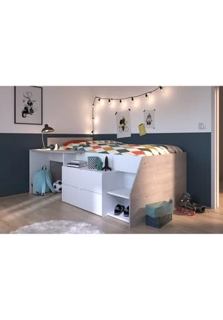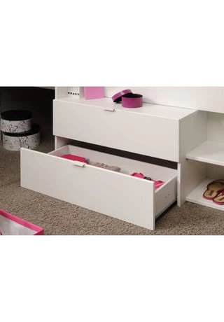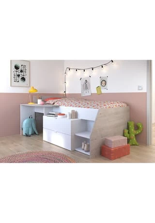 Dieses schöne Hochbett verfügt neben der gemütlichen Liegefläche über eine große Ablagefläche, die z.B. als Schreibtisch genutzt werden kann, eine kleine Kommode und viel Stauraum unter dem Bett. Maße: B203 x H90 x T135 cm Lieferumfang: Multifunktions Hochbett, Montagematerial und Montageanleitung (ohne Lattenrost, Matratze und Dekoration)
