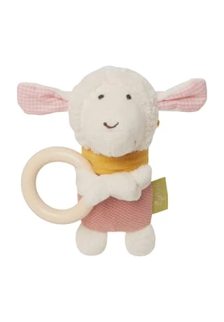 Das niedliche Schäfchen wird aus einem weichen Webplüsch und einem sehr hübschen alt rosafarbenen Struktur Sweat – alles Bio-Baumwolle – gefertigt, das Köpfchen ist mit 100 % Schafschurwolle gefüllt. Der etwa 13 cm große Greifling ist ideal für kleine Babyhände und ist somit das perfekte Spielzeug für erste Wachphasen des Babys. Das süße Schäfchen mit dem angeknotetem Holzring aus Buchenholz ist bereit, mit allen Sinnen erforscht zu werden. Das wunderbar glatt verarbeitete Holz bietet haptische Abwechslung. Ein besonderer Spaß ist auch die eingebaute Rassel – eine tolle Belohnung für erfolgreiche Greifversuche. Alle Materialien sind hochwertig verarbeitet und halten auch häufiger Wäsche im Wollwaschgang der Waschmaschine stand. Der Buchenholzring kann vor dem Waschen entfernt und mit einem feuchten Tuch gereinigt werden. Das Halstüchlein ist fest fixiert, sodass kein Verschlucken möglich ist.