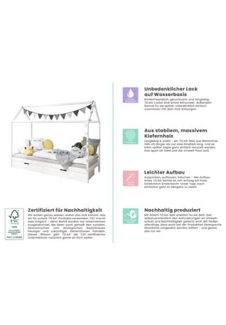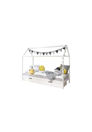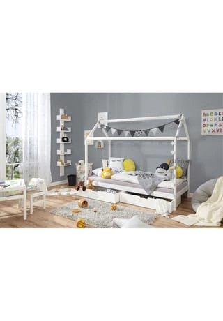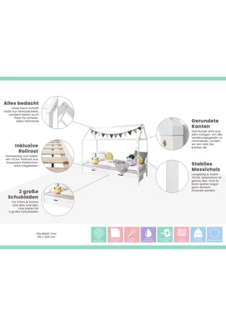 Hausbett, 2x Bettschubkästen, Federleisten Rollrost, Montagematerial, Montageanleitung (ohne Matratze und Dekoration)