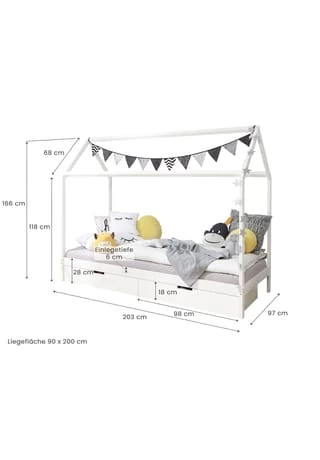 Ein richtiger Kindertraum – Dieses hochwertige, minimalistische Hausbett in edler Optik lädt zum Träumen ein und bietet deinem Schatz einen Ort zum Wohlfühlen und Austoben. Das aus massiver Kiefer gefertigte Bett bietet eine Liegefläche von 90 x 200 cm und bietet dir mit seinen 2 großen Bettschubladen extra viel Stauraum für allerlei Dinge und Utensilien. Der individuellen Gestaltung deines Hausbettes sind keine Grenzen gesetzt. So wird das Toben richtig schön. Maße: B203 cm x H166 cm x T97 cm Lieferumfang: Hausbett, Bettschubkästen, Federleisten, Montagematerial, Montageanleitung (ohne Matratze und Dekoration)