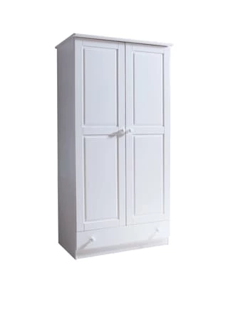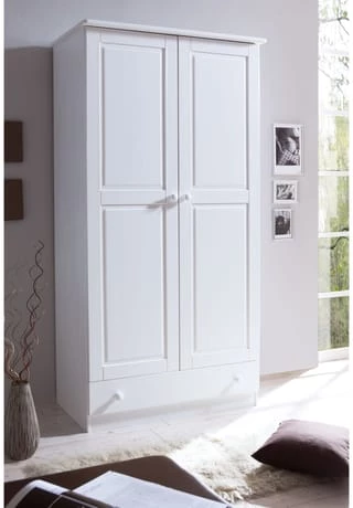 Dieser Kleiderschrank aus massiver Kiefer bietet nicht nur ein schönes Äußeres und einen stabilen Aufbau, sondern auch eine praktische Inneneinteilung. Innen findet sich oben ein durchgehendes Wäschefach, links zwei Einlegeböden und rechts eine Kleiderstange. Die hochwertige Verarbeitung und der feste Stand sorgen für eine hohe Langlebigkeit. In naturbelassener Optik oder weißer Lackierung erhältlich! Maße: B96 x H187 x T56 cm Lieferumfang: Kleiderschrank, Montagematerial und Montageanleitung